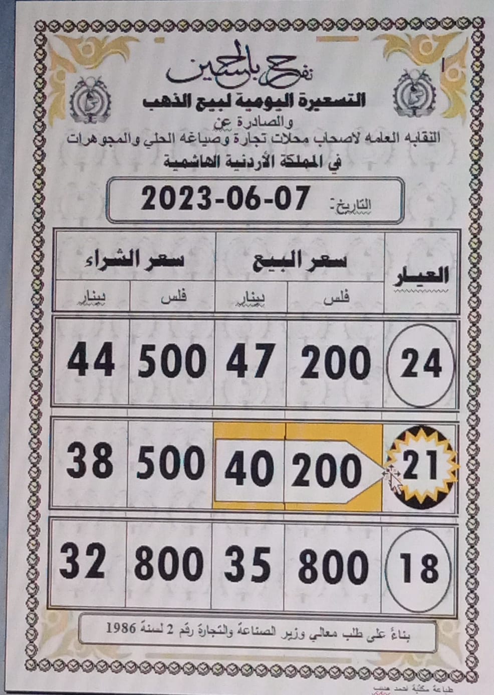 وبلغ سعر غرام الذهب من عيار 21، الأكثر رغبة لدى الأردنيين 40.20 دينارا لجهة الشراء من المحلات، و38،50 دينارا لجهة البيع.