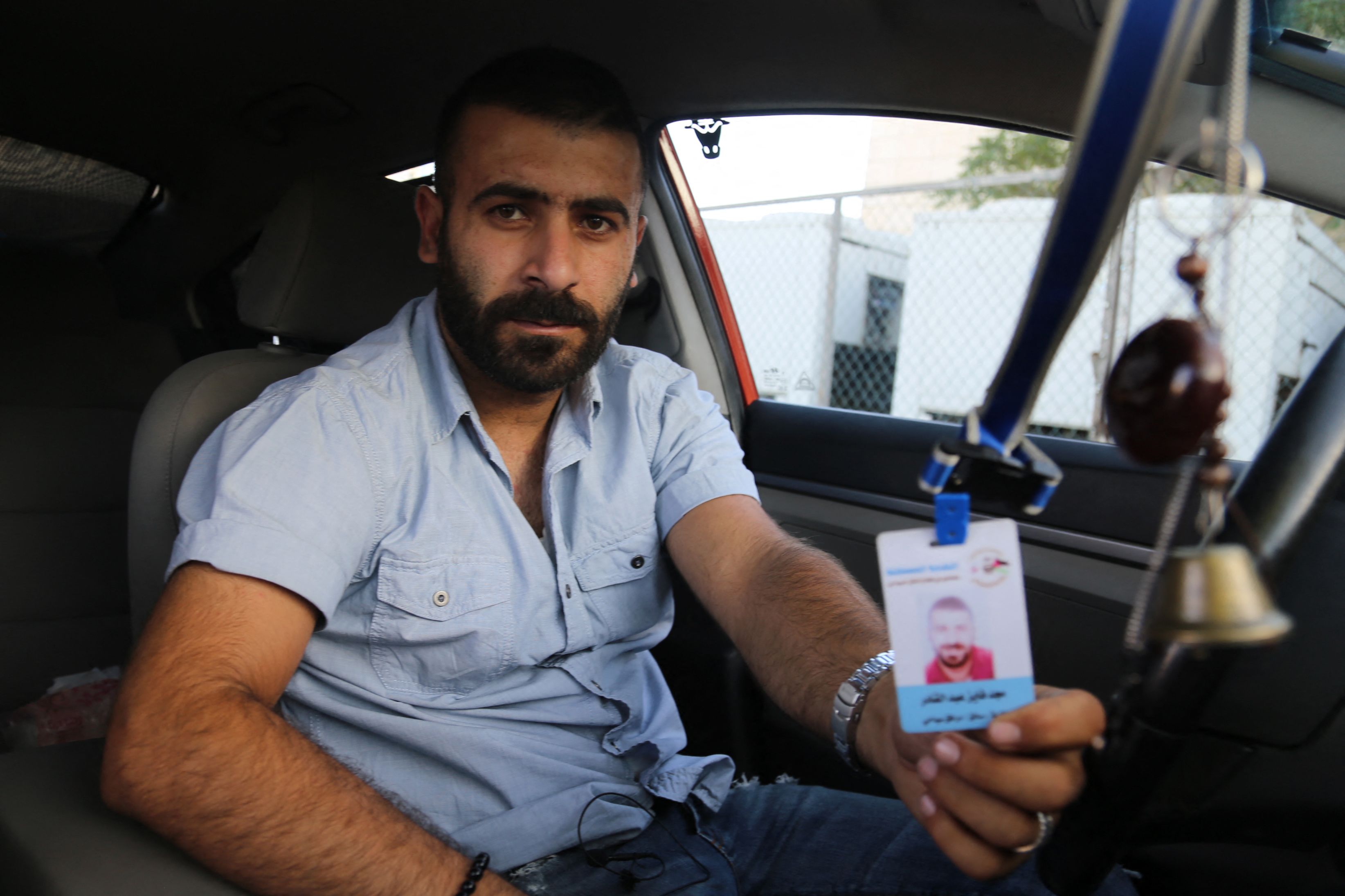 An Uber driver shows his professional card in Amman. He is one of many doctors, lawyers and entrepreneurs who have taken up driving to make ends meet. AFP